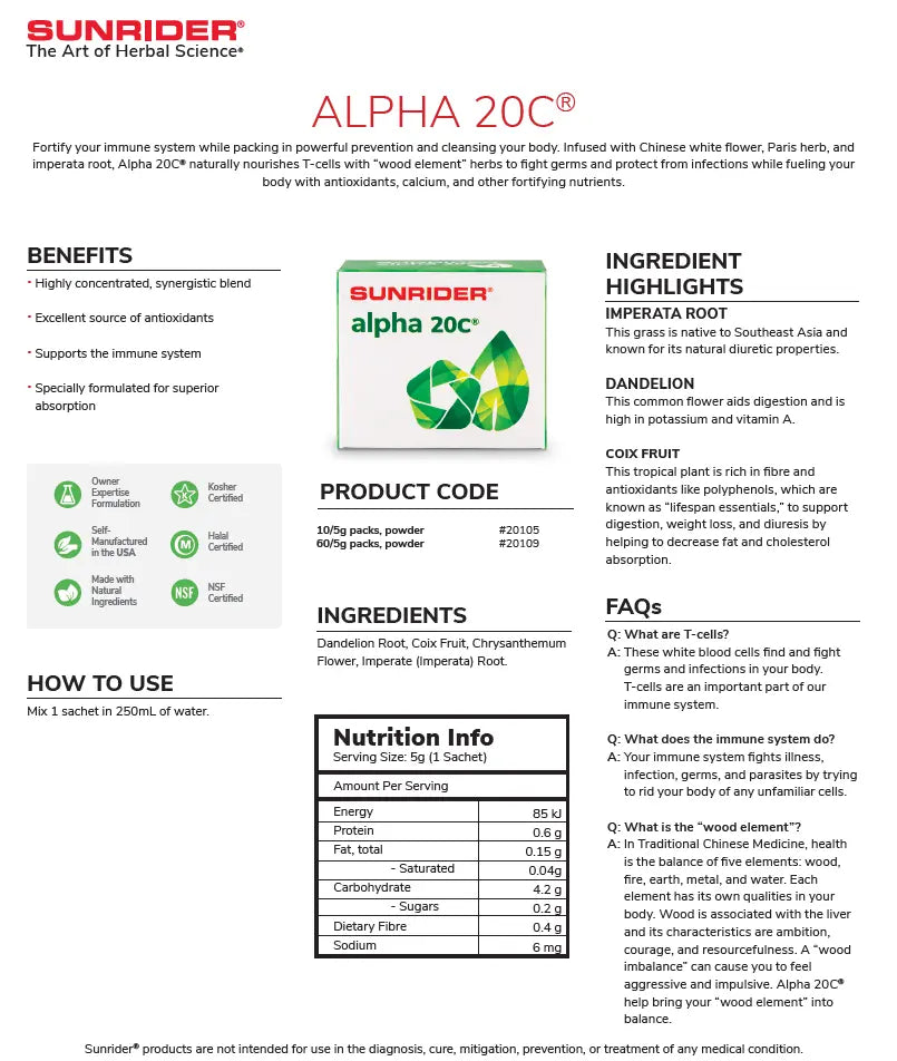 Fortify your immune system while packing in powerful prevention and cleansing your body. Infused with Chinese white flower, Paris herb, and imperata root, Alpha 20C® naturally nourishes T-cells with “wood element” herbs to fight germs and protect from infections while fueling your body with antioxidants, calcium, and other fortifying nutrients.