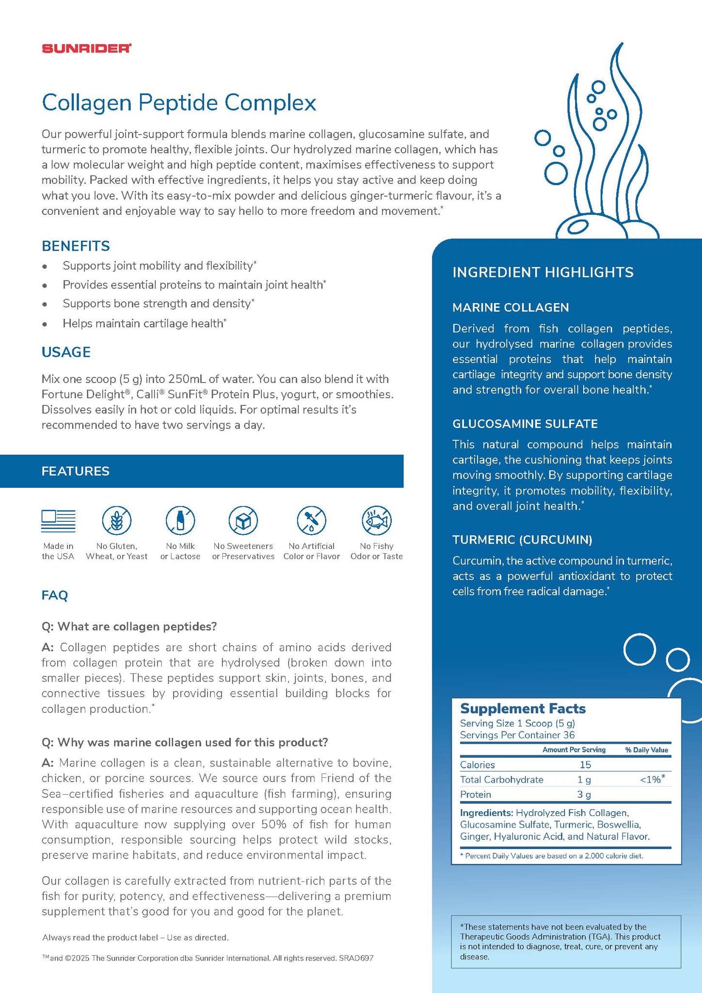 Mix one scoop (5 g) into 250mL of water twice a day. Our collagen formula dissolves effortlessly in both hot and cold liquids. For added variety, you can also mix it with Fortune Delight®, Calli® tea, your favorite SunFit® Protein Plus flavour, yogurt, or smoothies. It’s recommended to have two servings a day for best results.