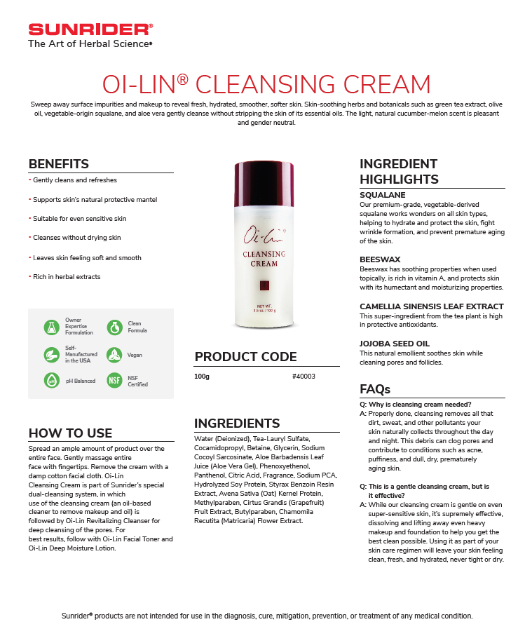 Spread an ample amount of product over the entire face. Gently massage entire face with fingertips. Remove the cream with a damp cotton facial cloth. Oi-Lin® Cleansing Cream is part of Sunrider’s special dual-cleansing system, in which use of the cleansing cream (an oil-based cleaner to remove makeup and oil) is followed by Oi-Lin® Revitalizing Cleanser for deep cleansing of the pores. For best results, follow with Oi-Lin® Facial Toner and Oi-Lin® Deep Moisture Lotion.