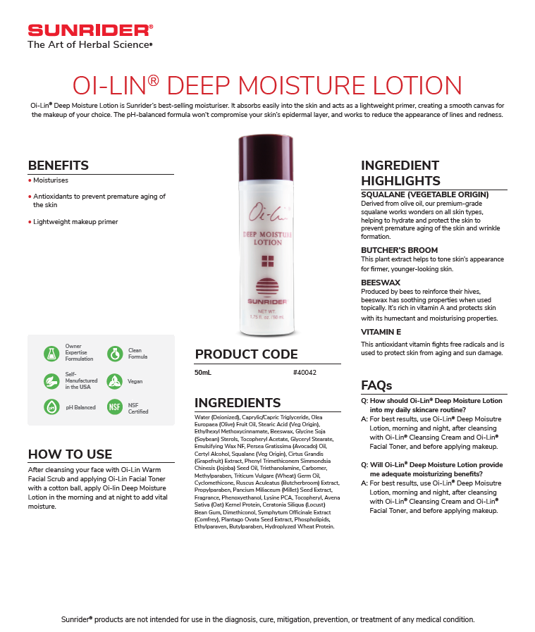 After cleansing your face with Oi-Lin® Warm Facial Scrub and applying Kandesn® Astringent with a cotton ball, apply Oi-lin® Deep Moisture Lotion in the morning and at night to add vital moisture.