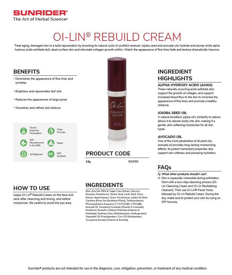 Apply Oi-Lin® Rebuild Cream on the face and neck after cleansing and toning. For best results, apply over Oi-Lin® Exceptional Cream. Be careful to avoid the eye area.