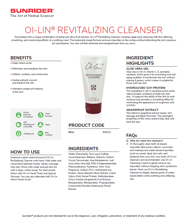 Dispense a pearl-sized amount of Oi-Lin® Revitalizing Cleanser onto hand. Add water and rub product between hands. Gently massage onto skin. Rinse with water and pat skin dry with a clean, cotton towel. For best results, follow with Oi-Lin® Facial Toner and Special Treatments. You may also alternate with Oi-Lin® Warm Facial Scrub.