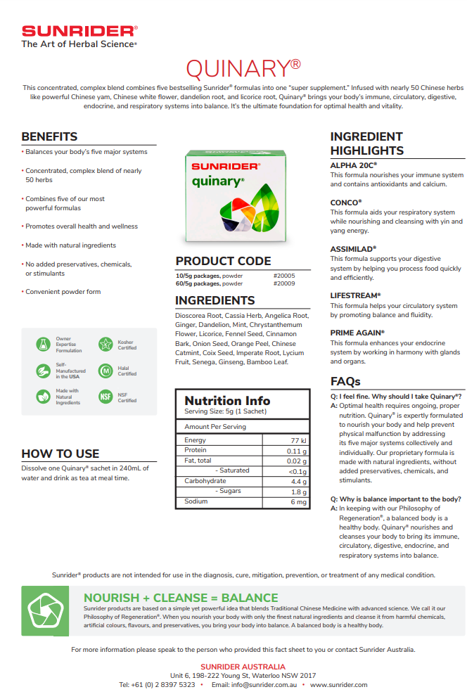 This concentrated, complex blend combines five bestselling Sunrider® formulas (Alpha 20C®, Conco®, Assimilad®, Lifestream®, Prime Again®) into one “super supplement.” Infused with nearly 50 Chinese herbs like powerful Chinese yam, Chinese white flower, dandelion root, and liquorice root, Quinary® brings your body’s immune, circulatory, digestive, endocrine, and respiratory systems into balance. It’s the ultimate foundation for optimal health and vitality.